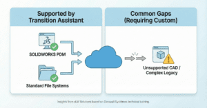 At a high level, Transition Assistant was presented as supporting several common cloud migration paths, with specific limitations based on source system and CAD type, including: